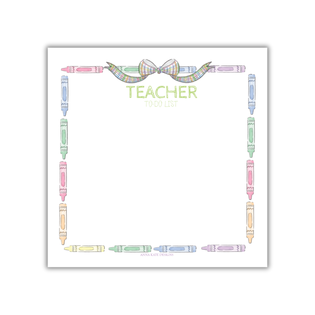 Bring a burst of color to your daily tasks with our Crayon Border Teacher To-Do List Notepad! Wrapped in a rainbow of watercolor crayons and topped with the happiest plaid bow, this design is pure school-day sunshine. It’s the perfect blend of playful and practical—just like your favorite teacher (yes, that’s you!).