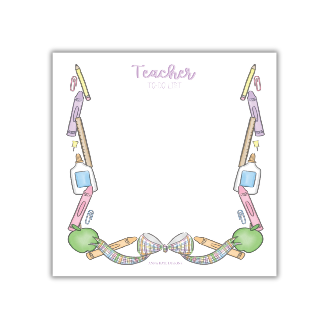 Because sticky notes just aren’t cutting it anymore! Our Teacher To-Do List Notepad is a classroom essential turned adorable desk candy. Featuring pastel crayons, apples, glue bottles, and the sweetest plaid bow you've ever seen, this notepad is ready to help you conquer lesson plans, to-dos, and all the things that keep your classroom humming.